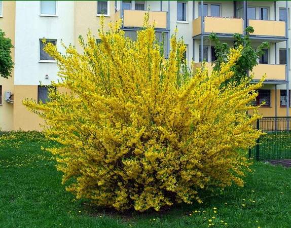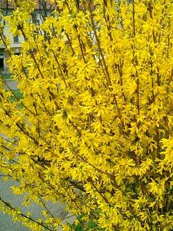Форзиция Goldzauber (Голдзаубер). Сорт Форзиции Goldzauber (Голдзаубер) создан немецкими селекционерами. Растения можно сажать практически во всех российских регионах, так как они морозостойкие. Крона у кустарника раскидистая, побеги поникшие. Высота взрослой Форзиции этого сорта — 1,7 м.