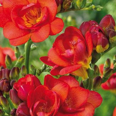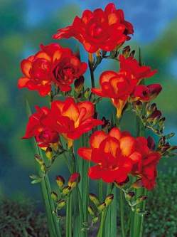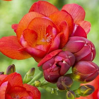 Фрезия гибридная махровая Red (Ред). Цветы фрезии окрашены в ярко-красный оттенок с вкраплением нежно-белого у основания лепестков, диаметр цветочков до 6 см. Аромат насыщенный, напоминает запах ландыша. Листья линейные, узкие, зеленые, цветонос крепкий, высотою до 40 см.