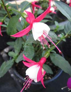 Фуксия бело-розовая (1 л). Лопасти темно-розовые, почти красные, венчик белый. Растение кустовое, обильно цветет. Высота около 30 см.