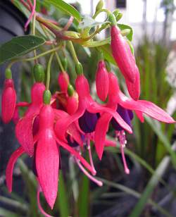Фуксия красно-фиолетовая (1 л). Лопасти темно-розовые, почти красные, венчик фиолетовый. Растение кустовое, обильно цветет. Высота около 30 см.