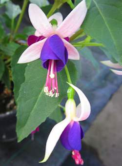 Фуксия розово-сиреневая (1 л). Лопасти светло-розовые, венчик темно-сиреневый. Растение кустовое, обильно цветет. Высота около 30 см.