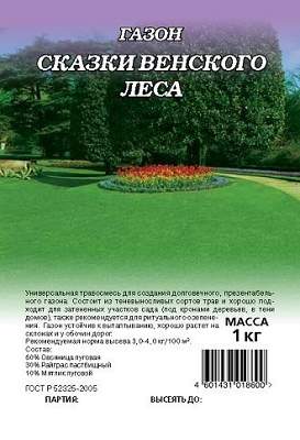 Газон Сказки Венского леса 0,3 кг. Универсальная травосмесь для создания долговечного, презентабельного газона. Состоит из теневыносливых сортов трав и хорошо подходит для затененных участков сада (под кронами деревьев, в тени домов), также рекомендуется для ритуального озеленения. Газон устойчив к вытаптыванию, хорошо растет на склонах и у обочин дорог. Рекомендуемая норма высева 3,0-4,0 кг/100 м².
