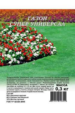 Газон Супер Универсал универсальный. Универсальная травосмесь для озеленения. Состав из плотно растущих, устойчивых к вытаптыванию и неблагоприятным уловиям выращивания трав позволяет использовать газон повсеместно. Хорошо растет при небольшом затенении, на склонах, у обочин дорог. Рекомендуемая норма высева 3,0-4,0 кг/100 м2. Состав: 50% Овсяница красная, 40% Райграс пастбищный, 10% Мятлик луговой.