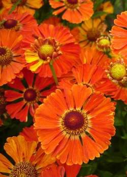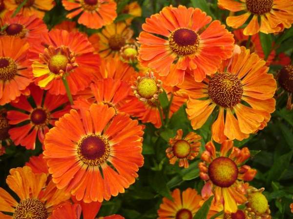 Гелениум Little Orange (Литл Оранж). Окраска цветков ярко-оранжевая с желтыми бликами. Центр вначале бордовый, затем коричневый. Высота не более 60 см. Начинает цвести с июля. Отличный сорт, надежный, хорошо разрастается.