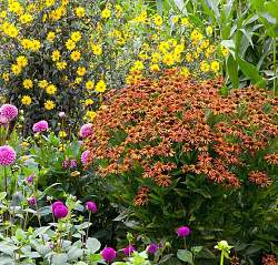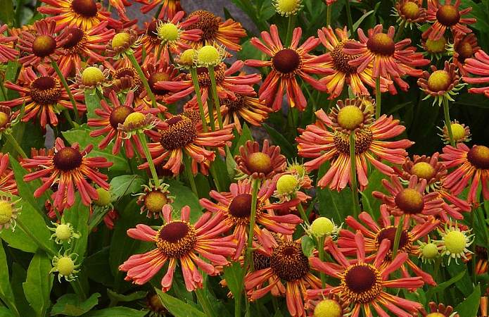 Гелениум гибридный Loysder Wieck (Лойсдер Вик). Лепестки свернуты в трубочку, верхняя часть лепестков кораллово-красная, внутренняя — желтая. Благодаря этому цветущий куст переливается от красных до ярко-желтых тонов. "Растопыренные" цветки смотрятся очень мило, забавно, превосходно дополняют цветники в природном стиле.