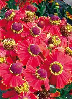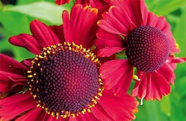 Гелениум Red Jewel (Ред Джуэл). Очень яркий, сочного красного цвета с легким синеватым оттенком. По краю лепестков неравномерная золотистая кайма. Центр меняет цвет от пурпурного до коричневого. Цветет с августа. Высота взрослого растения около 70 см.