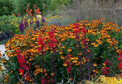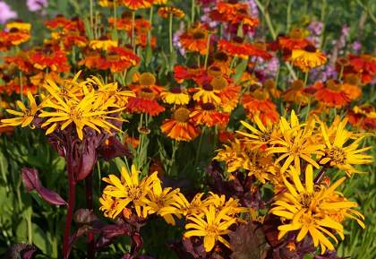Гелениум Sahin's Early Flowerer (Сахинс Эрли Флаурер). Цветки вначале красно-оранжевые, затем оранжево-жёлтые. Окраска цветка варьирует от красно-оранжевой в жаркую погоду до жёлтой в прохладную. Высота около 90 см, цветки очень крупные — до 7 см. Цветение очень длительное и обильное — с июля до заморозков.