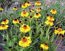 Гелениум гибридный The Bishop (Зе Бишоп). Высота до 60 см. Цветки ярко-желтые с коричневой серединой. Куст прочный, прямостоячий. Цветение дружное, очень обильное и продолжительное, начиная с августа. Может расти на солнце и в полутени.
