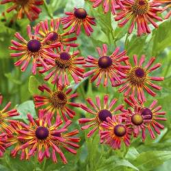 Гелениум Tie Dye (Тай Дай). Красивейший сорт, у которого язычковые цветки свернуты в трубочку. Поскольку с внешней стороны они желтые, а с обратной пурпурно-красные, внешне выглядит, будто цветок пестро окрашен. Корзинка коричневая, красиво оттеняет язычковые цветки. Листья яркие. Стебли мощные, разветвленные. Высота 80 см. Отлично подходит для срезки.