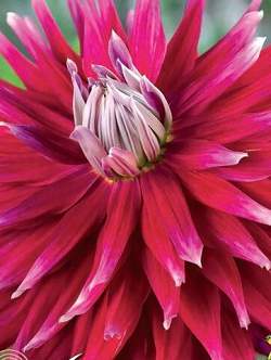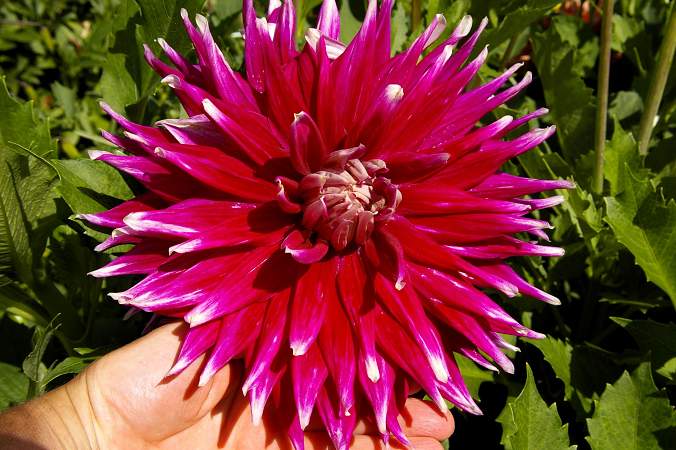 Георгин Ac Dark Horse (Эй Си Дарк Хорс). Очень крупный красный с лиловым оттенком, кончики лепестков более светлые, с внутренней стороны молочно-белый, диаметр цветка 23 см.