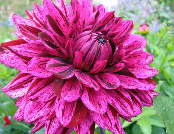 Георгин Art Act (Арт Акт). Фиолетовый цветок с красными, бордовыми и темно-пурпурными штрихами; диаметр 17 см. Настоящее произведение искусства. Высота куста 80 см.