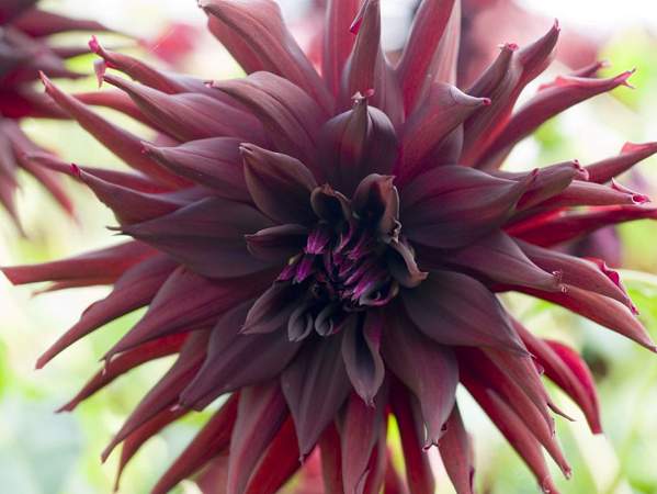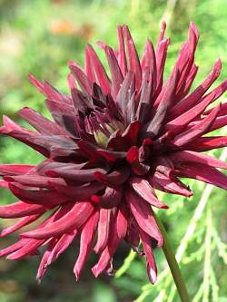 Георгин Black Narcissus (Блэк Нарцисс). Шикарный кактусовый цветок с темно-красными почти черными лепестками заостренной формы смотрится великолепно на протяжении всего лета. Цветок у этой георгины среднего размера, до 15 см в диаметре. Кусты средние, до 90 см. Цветет георгин продолжительное время на протяжении всего лета до поздней осени.