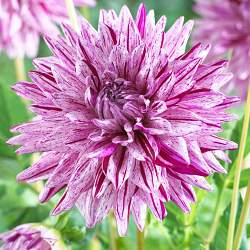 Георгин Blackberry Ripple (Блэкберри Риппл). На белом фоне лиловые точки и штрихи, диаметр цветка 13 см.