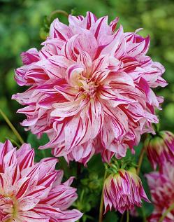 Георгин Bristol Stripe (Бристол Страйп). Великолепный сорт! Очень крупный, розово-белый полосатый цветок с волнистыми лепестками, до 22 см в диаметре, цветение длительное. Сорт легко размножается, дает хорошую срезку, подходит для выращивания в контейнере.