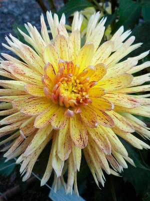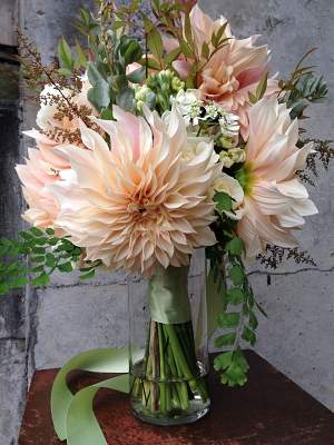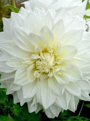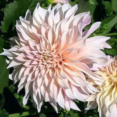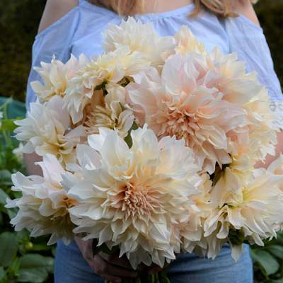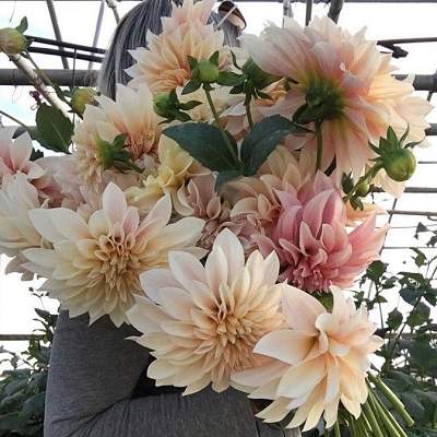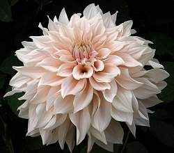 Георгин Cafe au Lait (Кафе о Лэ). Роскошный георгин из группы декоративных. Цвет кофе с молоком. Диаметр соцветия более 22 см. Соцветие прекрасной формы, лепестки волнистые, отгибающиеся. Высота 120 см.