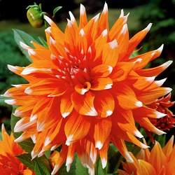Георгин Color Spectacle (Колор Спектекл). Относится к группе полукактусовых георгинов. Очень яркий, нарядный сорт станет солнечным акцентом на любом участке. Белые кончики лепестков освежают насыщенно-оранжевый цветок. Достойный сорт для любой коллекции. Предпочитает солнце.