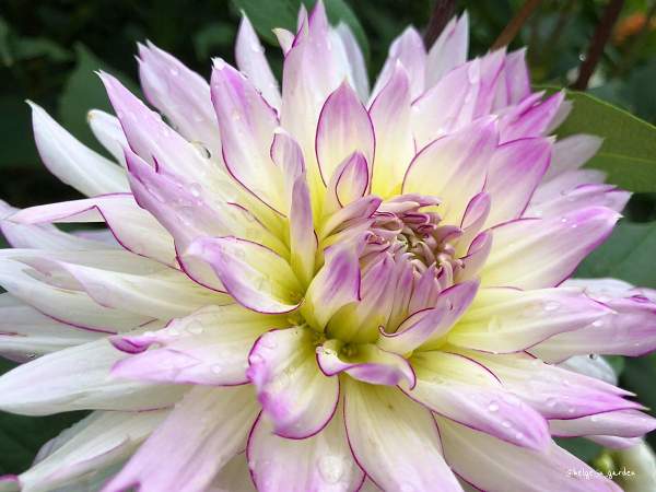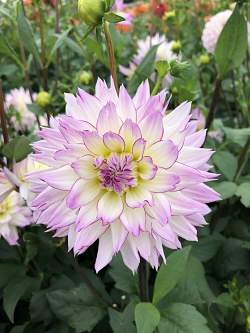 Георгин Crazy Love (Крейзи Лав). Белый со светло-сиреневыми кончиками и тонкой сиреневой каймой, диаметр цветка 15 см.