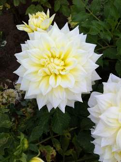 Георгин Cynthia Louise (Синтия Луиза). Очень крупный, диаметр цветка 25 см, центр желтый, лепестки кремовой окраски, эффектные, придают объем и экстравагантность. Цветоносы прочные, идеально подходит для срезки.