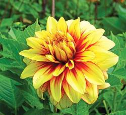 Георгин Dazzling Sun (Дэззлинг Сан). Ярко-желтый с малиновыми штрихами в центре и тонкой малиновой каймой, диаметр цветка 15 см.