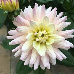 Георгин Diana`s Memory (Дайанас Мемори). Великолепные нежные кремовые цветки с легким оттенком лавандово-розового на кончиках, центр желтый. Диаметр цветка 15 см.