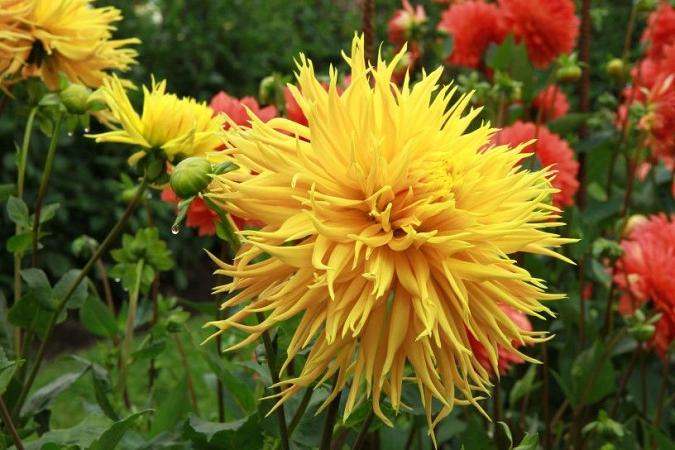 Георгин Encore (Энкор). Высота 90-120 см. Размер золотисто-желтого цветка 25 см. Крупные густомахровые цветки с желтыми узкими лепестками, свернутыми у основания и рассеченными на краях, смотрятся по-настоящему великолепно!