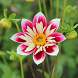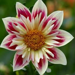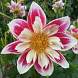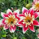 Георгин Fashion Monger (Фешн Монджер). Цветок прелестный, достаточно крупный (10 см). Внешние лепестки с крупными малиновыми мазками, внутренние — кремовые трубочки. Анемоновидный георгин, который обильно цветет и прекрасно смотрится в на заднем плане смешанного цветника или в центре клумбы.