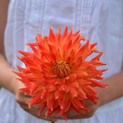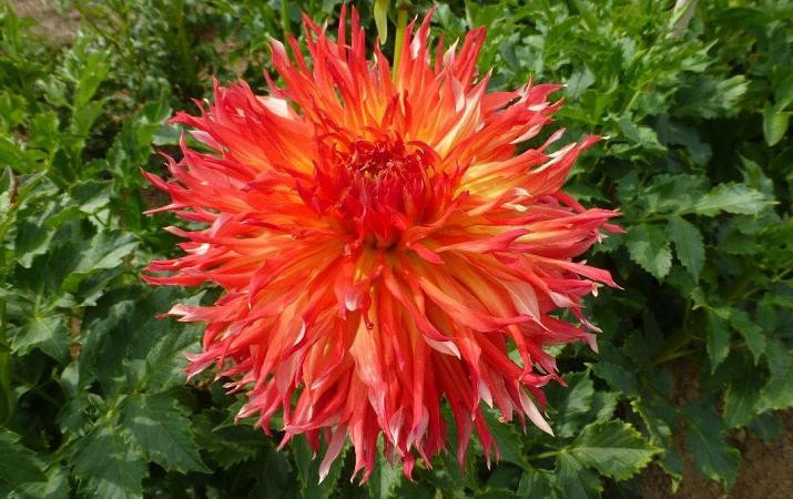 Георгин Fired Up (Фаед Ап). Гигант, как по высоте куста, так и по размеру цветков. Цветок у основания желтый, края лепестков красно-оранжевые, слегка расщепленный. Цветок до 25 см в диаметре. Высота куста до 140 см.