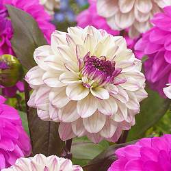 Георгин Flashback (Флэшбэк). Кремово-белый, с розовыми штрихами и кантом, диаметр цветка 12 см.
