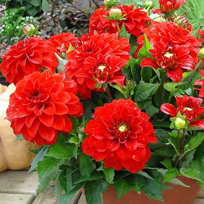 Георгин Gallery Singer (Геллери Сингер). Ярко-красный бордюрный сорт. Цветы крупные, до 15 см в диаметре. Высота куста 30-45 см. Серия "Гэллери" (Gallery) объединяет сорта георгинов нового поколения, предназначенные для оформления переднего края бордюра и выращивания в контейнерах.