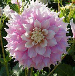 Георгин Gitts Perfection (Гиттс Перфекшн). Очень крупный, диаметр цветка 20 см, очаровательный, переливчатый, центр нежно-розовый, края белые, заостренной формы.