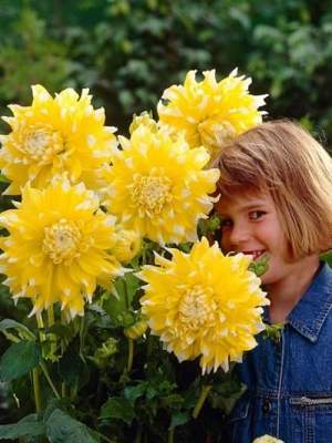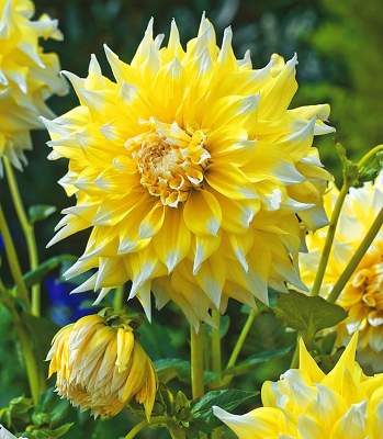 Георгин Grand Prix (Гран При). Цветок очень крупный (25 см), пышный, с широкими лепестками. Цвет лимонно-желтый. Кончики лепестков белые. Высота 115 см.