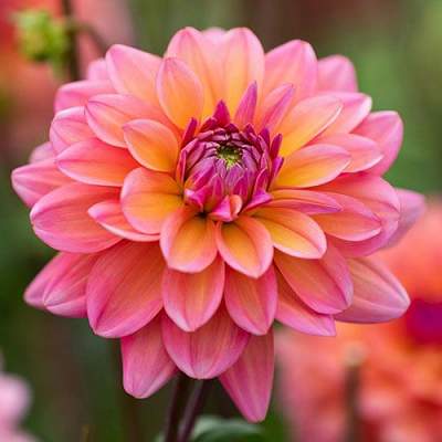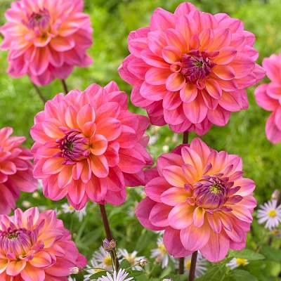 Георгин Great Silence (Грейт Сайленс). Цветок диаметром 12 см, при полном раскрытии становится шаровидным. Красивый цвет, состоящий из переливов темно-розового и оранжевого. Высота куста 90 см. Отличная срезка.