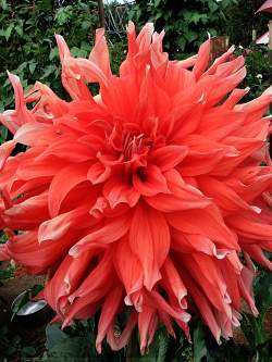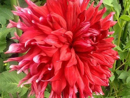 Георгин Hollyhill Clydesdale (Холлихилл Клайдсдейл). Полностью махровый цветок, диаметром 27 см, имеет плоские лепестки, слегка закрученные и отогнутые к стеблю, что делает его необыкновенно пышным. Яркие двухцветные цветы красновато-фуксиевого и белого оттенка.