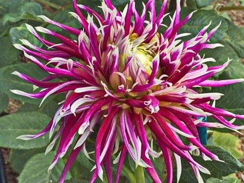 Георгин Hollyhill Spiderwoman (Холлихилл Спайдервуман). Среднерослый бордюрный георгин с махровыми цветами. Яркие двухцветные цветы красновато-пурпурного и белого оттенка. Соцветие корзинка, размера 20 см в диаметре.