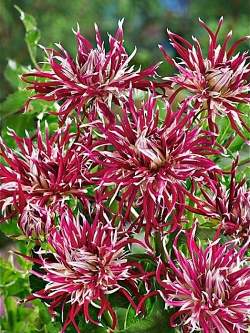 Крупные махровые соцветия кактусовых георгин состоят из удлиненных заостренных "лепестков", свернутых в узкие трубочки, почти иголки.