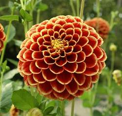 Георгин Jowey Hubert (Джоуи Хьюберт). Кирпично-красный с желтой окантовкой на лепестках, диаметр цветка 19 см.