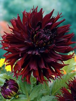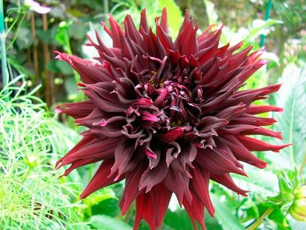 Георгин Kenora Macop-B (Кенора Макоп-Би). Высота взрослого растения до 100 см. Цветок очень крупный диаметром 22 см, бархатный, глубокий темно-красный. Лепесточки цветов георгины скручены в трубочку, благодаря чему выглядят более острыми, как иголочки. Цветение длительное и неоднократное, куст может цвести с июля месяца до поздней осени.