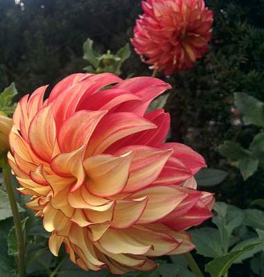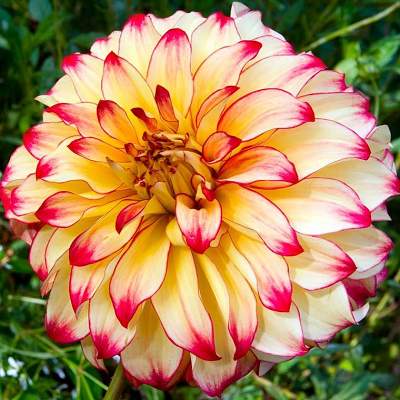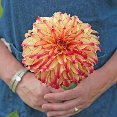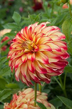 Георгин Lady Darlene (Леди Дарлин). Крупный, превращающийся со временем в шар, цветок. Лепестки желтые с красной полоской и кантом. Диаметр цветка 20 см. С возрастом окраска меняется, очень красив на всех стадиях. Высота куста 110 см.