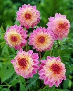 Георгин анемоновидный Lambada (Ламбада). Кремово-жёлтый центр, розовая юбочка, высота 110 см, диаметр цветка 10-15 см.