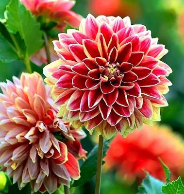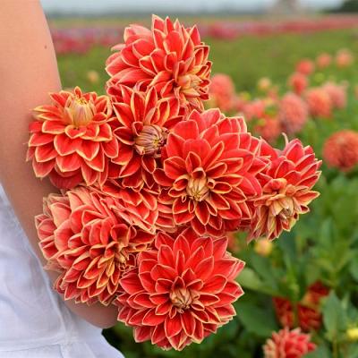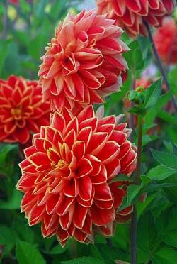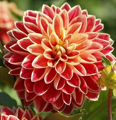 Георгин Maxime (Максим). Темно-апельсиновые лепестки украшены четкой желтой каймой. Это делает насыщенный оранжевый цвет бутонов еще более выразительным и глубоким. Размер цветка 15 см. Высота куста 110 см. Прекрасная срезка.