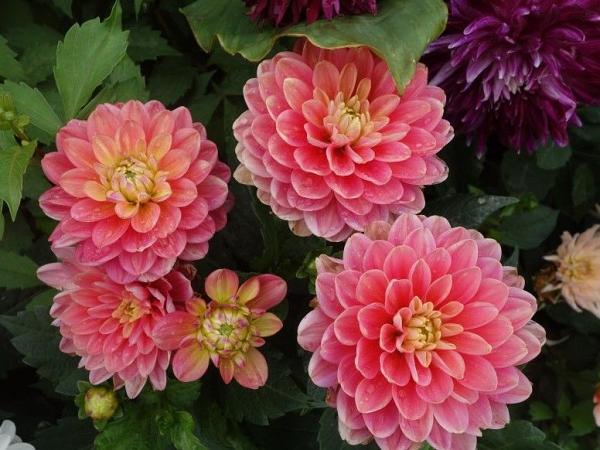 Георгин Melody Allegro (Мелоди Аллегро). Отличный сорт кораллово-розового цвета, кончики лепестков сиреневые, центр — желтый, диаметром цветок достигает 12 см, высота взрослого растения 60 см. Можно выращивать как и в открытом грунте, так и в контейнере благодаря его небольшому росту. Обильное цветет на протяжение всего лета.