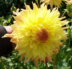 Георгин Mingus Joshua (Мингус Джошуа). Очень крупный желтый с абрикосовым оттенком, диаметр цветка 20 см.