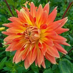 Георгин Motto (Мотто). Очень крупный оранжевый с желтым центром, диаметр цветка 20 см.