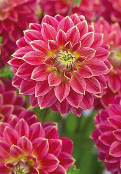 Георгин Mr. Optimist (Мистер Оптимист). Палево-красный с ярко-жёлтыми стрелками, диаметром 15 см.