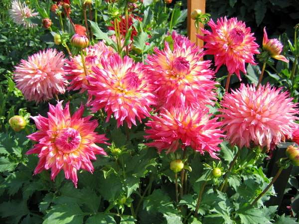 Полив и внесение удобрений. Поливать георгины надо регулярно, но без излишнего энтузиазма. Если при посадке лунка была хорошо удобрена, то первое внесение подкормки можно немного отложить до тех пор, пока не начнет образовываться зеленая масса. Если почва не была удобрена, то уже через неделю следует позаботиться о подкормке органикой. Сделать это легко. Достаточно выкопать по периметру куста лунки, всыпать в них удобрение, а затем выровнять почву граблями. Повторять процедуру рекомендуется несколько раз за сезон.