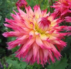 Георгин Nenekazi (Ненекази). Роскошный георгин из группы Декоративных бахромчатых. Лепестки желтые с нежно-розовыми кончиками. Очень крупный, диаметр соцветия около 20 см. Высота 100 см.