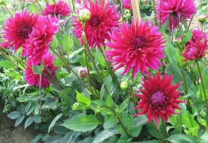 Полив и внесение удобрений. Поливать георгины надо регулярно, но без излишнего энтузиазма. Если при посадке лунка была хорошо удобрена, то первое внесение подкормки можно немного отложить до тех пор, пока не начнет образовываться зеленая масса. Если почва не была удобрена, то уже через неделю следует позаботиться о подкормке органикой. Сделать это легко. Достаточно выкопать по периметру куста лунки, всыпать в них удобрение, а затем выровнять почву граблями. Повторять процедуру рекомендуется несколько раз за сезон.