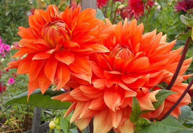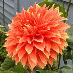Георгин Parkland Glory (Парлэнд Глори). Бесподобный сорт. Цветки очень крупные (20 см в диаметре), оранжевые с переливом до алого. Лепестки плоские, широкие, заостренные на концах. Куст мощный, пышный, стебли высотой до 100 см.