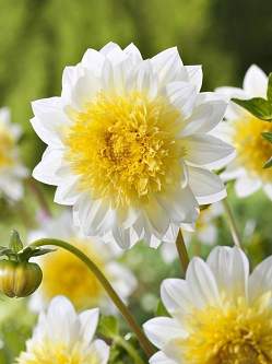 Георгин Paso Doble (Пасодобль). На цветоносе формируется анемоновидный бутон. Серединка состоит из ярко-желтых удлиненной формы мелких лепестков. Они собраны в плотную подушечку. Венчают их крупные белого окраса плоские лепестки, расположенные в один или три ряда. Цветение длится с середины июля до октября. Высота взрослого растения достигает 110 см, диаметр цветка 12 см.