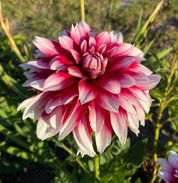 Георгин Patches (Пэтчиз). Очень крупный, диаметр цветка 20 см, контрастный, темно-бордовые лепестки с белыми кончиками. Пышно цветет, эффектно смотрится.